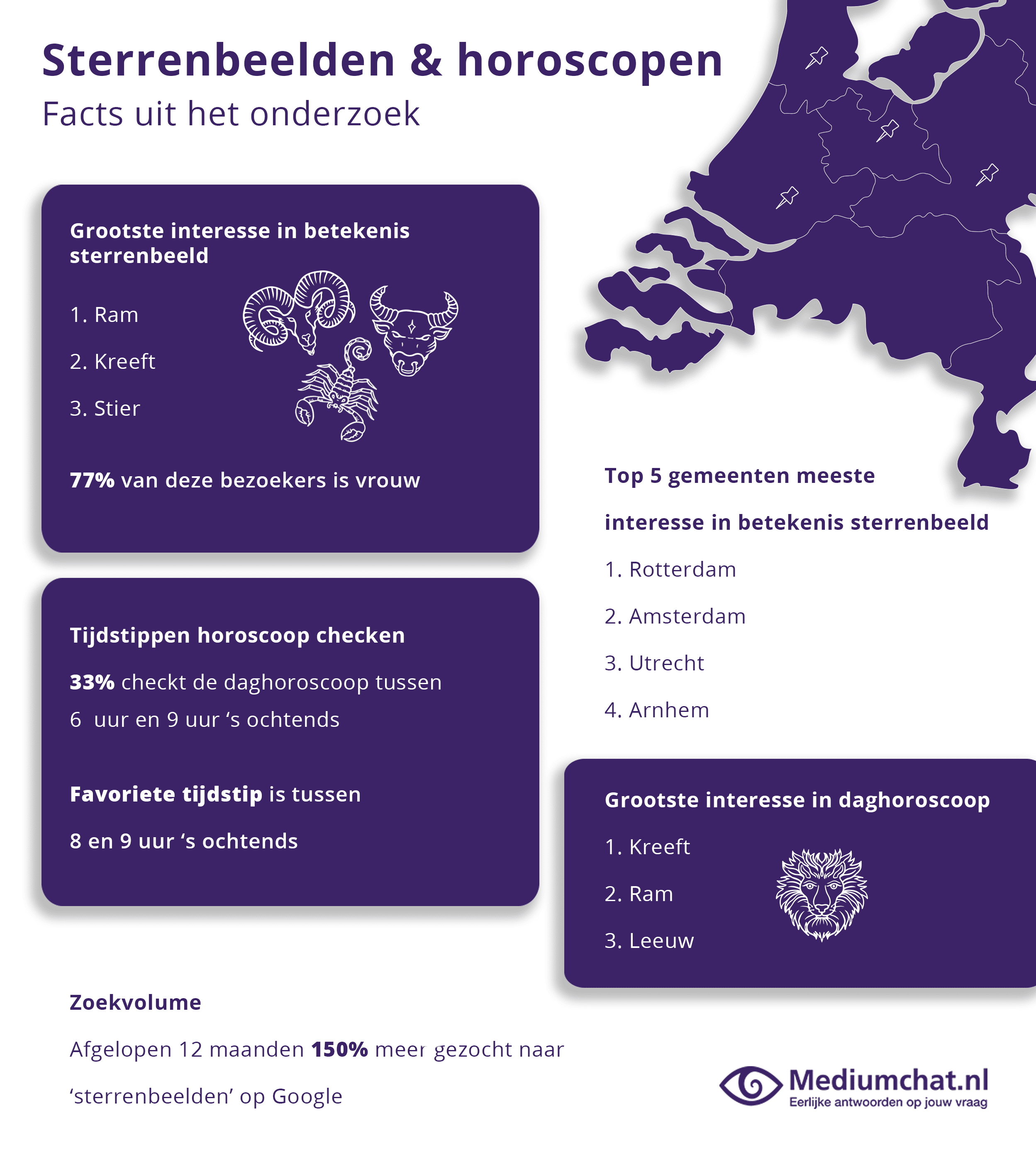 Het zoeken naar sterrenbeelden wordt steeds populairder. In een jaar tijd werd er 150% meer gezocht naar sterrenbeelden ten opzichte van een jaar eerder. Vooral in Rotterdam, Amsterdam en Utrecht kijken veel inwoners naar de betekenis van hun sterrenbeeld.